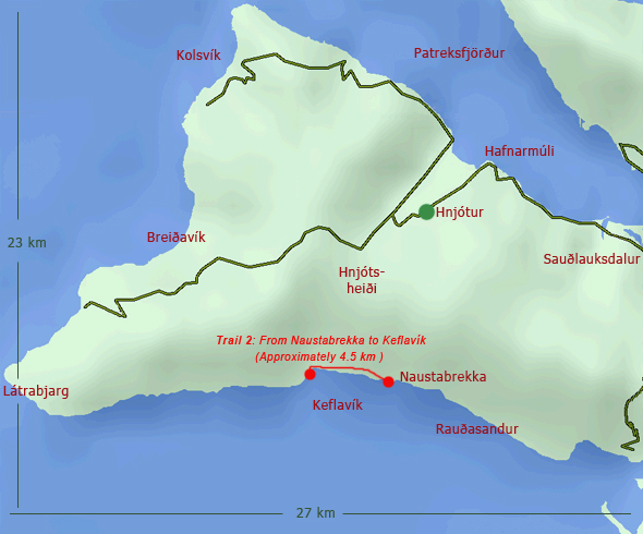 From Naustabrekka on to Kerlingarháls one encounters a steep slope with loose rocks. Upon reaching the top the path follows the ridge to the emergency shelter at Keflavík. This trail is a rather comfortable hike but one has to be careful on the ridge.